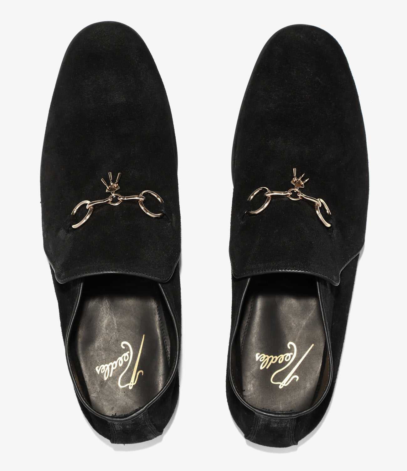 〈NEEDLES〉のシューズコレクション定番のチャッカ型スリッポンシューズ。アッパーにはタッセル飾り付きのビットが取り付けられ、カジュアルな中に華やかな印象を与えるデザインです。ライニング(内張り)をあえて排した仕様も特徴的で、ライニングがない分、軽快で足馴染みの良い仕上がりとなっています。アッパーの風合いの良いラフアウトのレザーを使用しています。