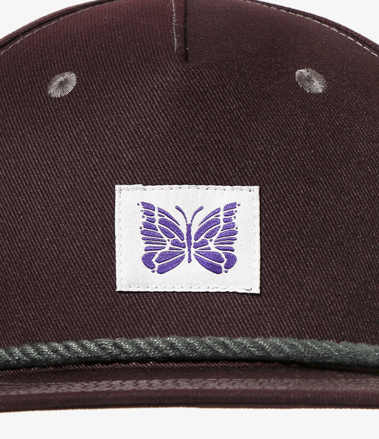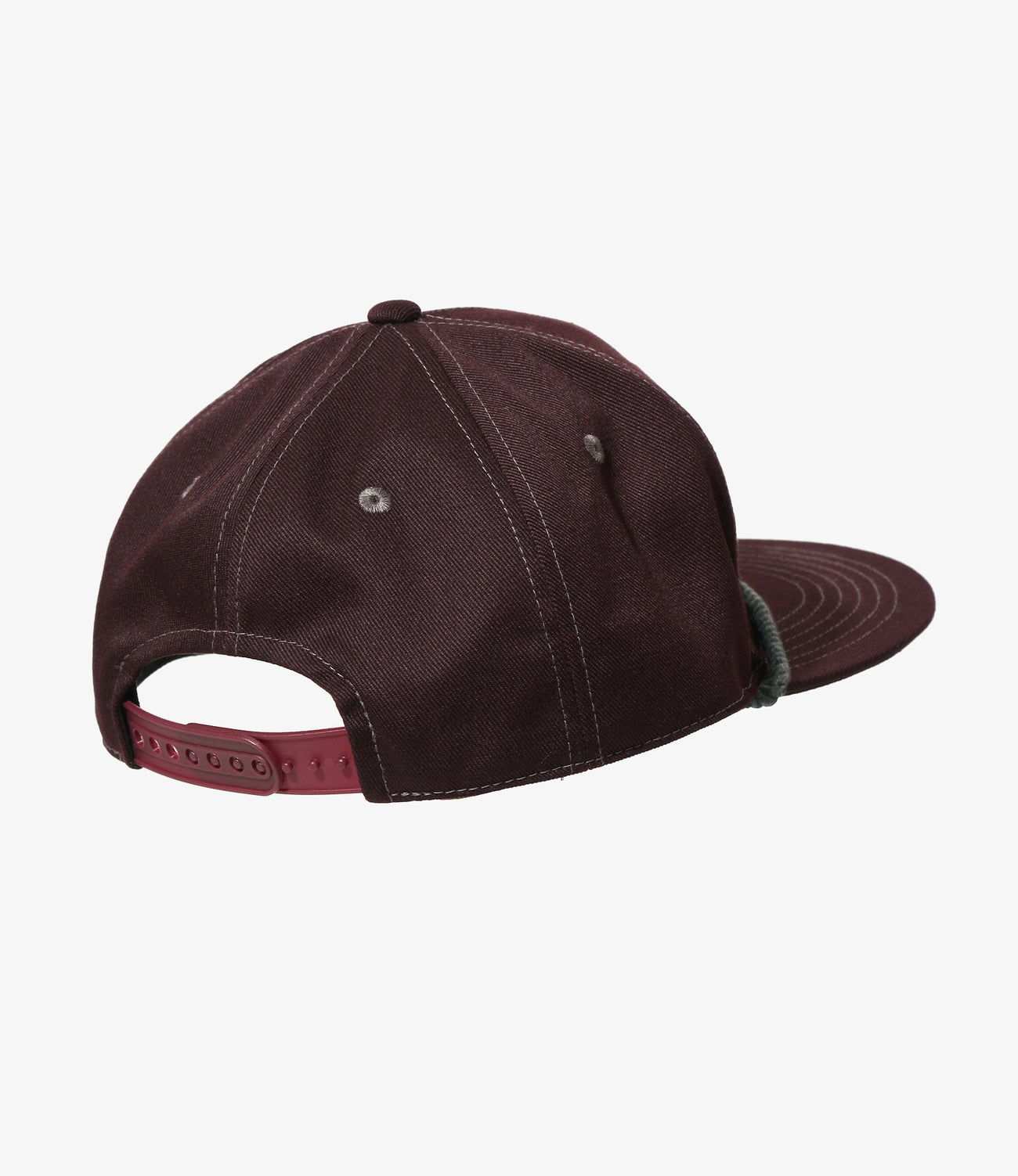 フロントにパピヨンのタグをあしらったベースボールキャップ。ブリムはフラットに、後ろはアジャスターを設けてサイズ調整可能にしています。キャップロープとステッチのアクセントカラーがクラシックな雰囲気を演出しています。カラーはバーガンディ、グリーン、ブラックの3色展開。