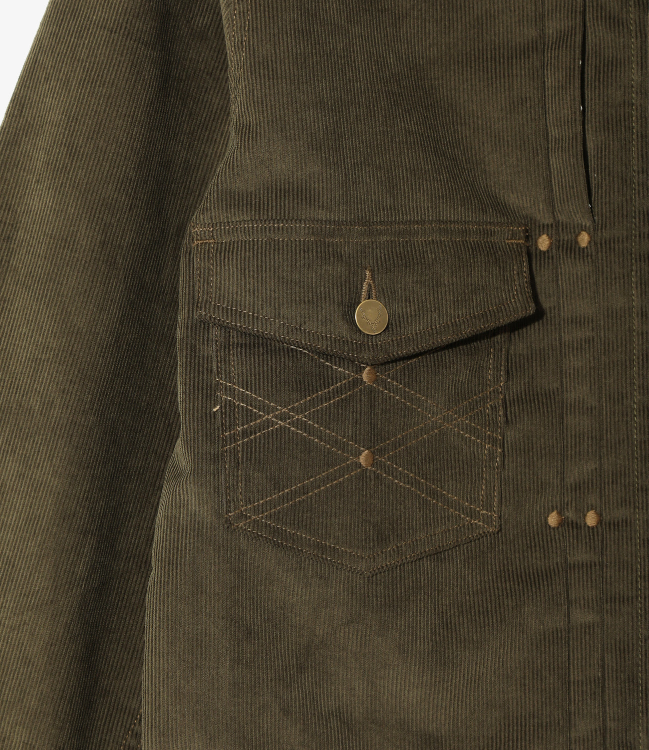 オーセンティックなジーンジャケットをベースにデザインされたトラッカージャケット。やや短めな丈とスッキリとしたシルエットが特徴的。シャツやTシャツなどとのレイヤードスタイルにも幅広く対応します。13Wのコーデュロイを使用したカジュアルな一着です。