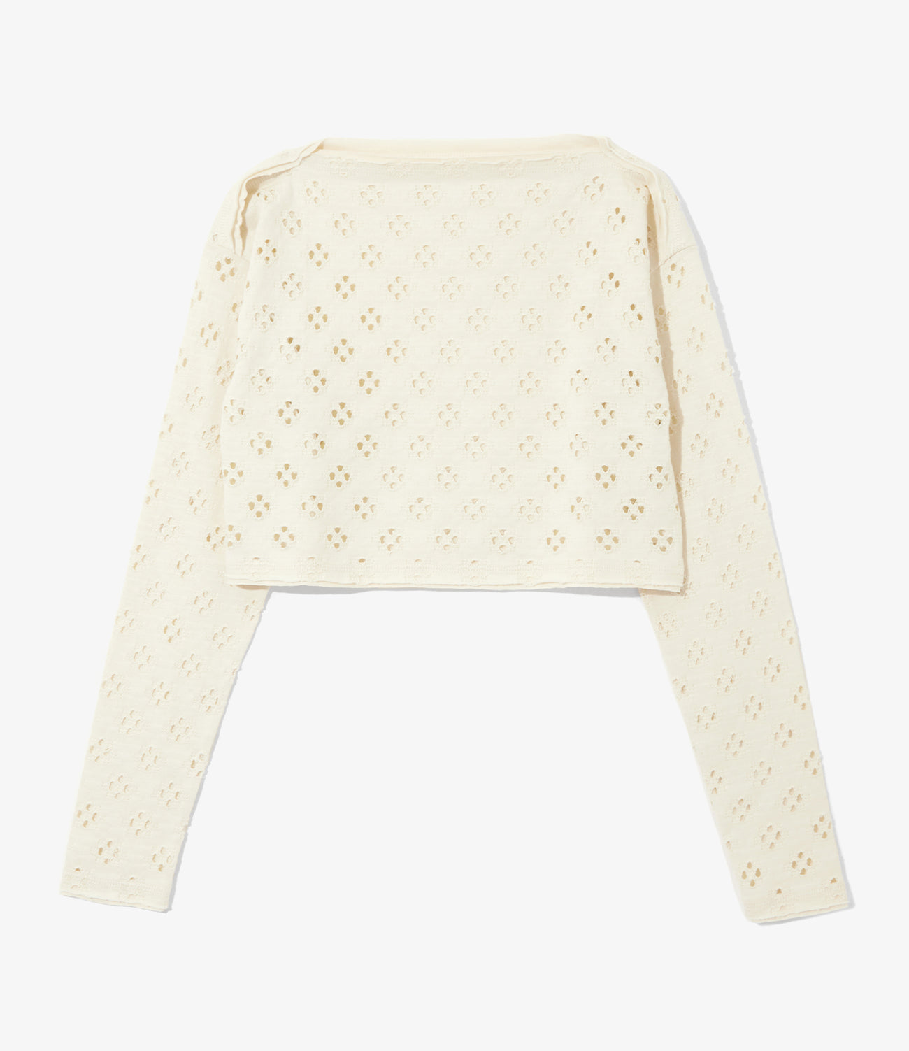 コットン100%の風吹天竺と呼ばれる大きな穴が特徴のカットソーを使用したコンパクトボディのバスクシャツ型のカットソーを作成しました。ボートネックで着丈はショート丈、ショルダー部分のスナップボタンを開閉することでチューブトップやミニスカートとしても着用いただけます。大きなカットワークから覗くカラーコーディネイトも楽しめます。