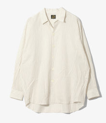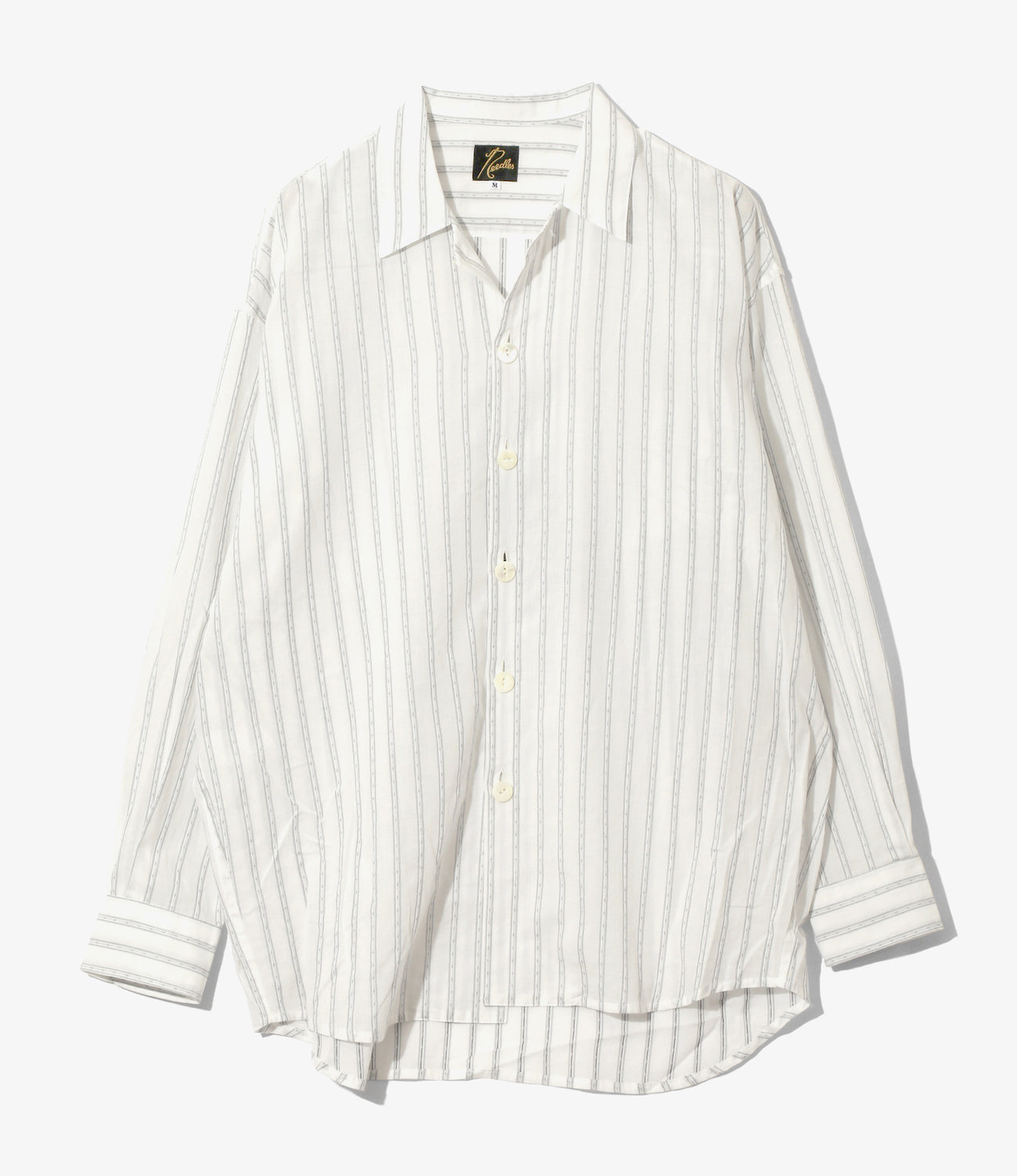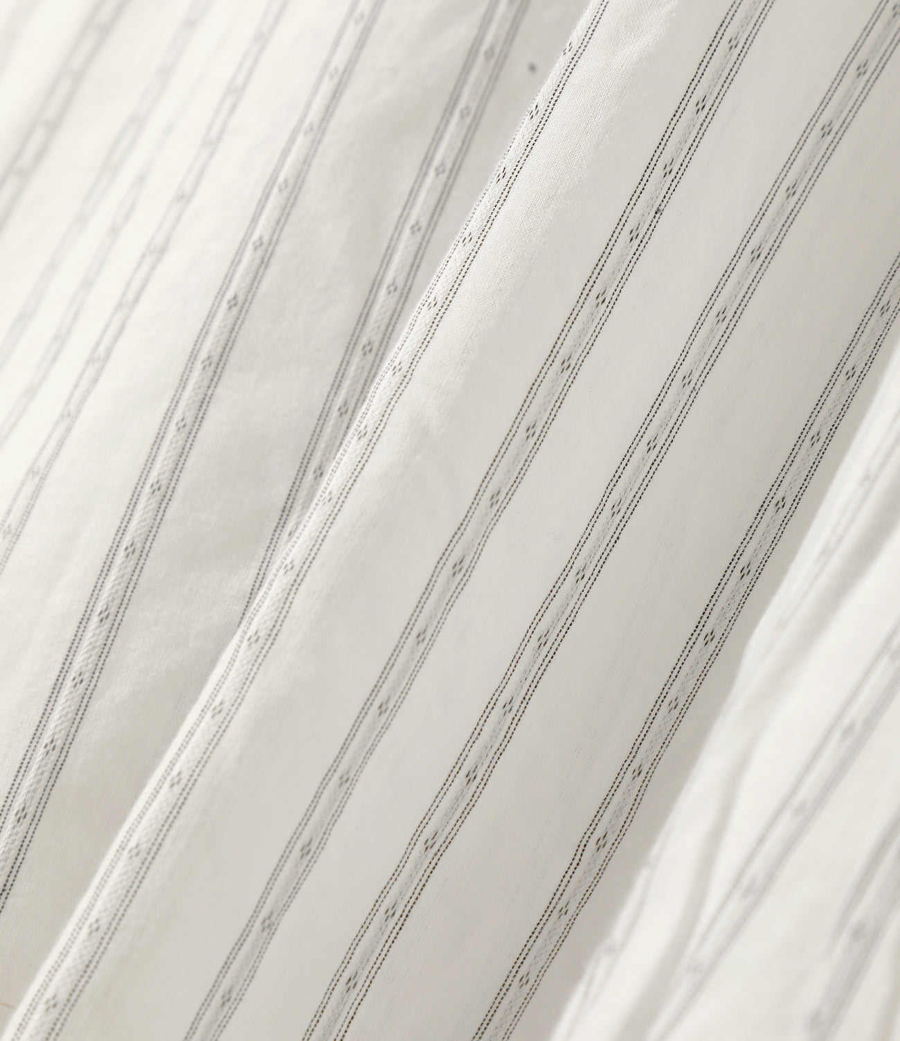 軽快さを引き立てるアンコンストラクション仕立てでデザインされたシャツ。芯地や裏地を排した柔らかなつくりが、テーラードライクなフォルムにリラックスした表情をもたらします。素材には細やかな凹凸感が浮かぶドビー織りストライプを採用。上品な光沢と繊細な表情が際立ち、シンプルながら奥行きのある印象を演出します。シャツとして単体での着用はもちろん、軽い羽織としても活躍します。