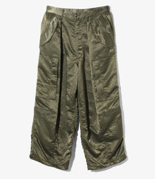 多種多様のジップポケットが搭載された、US ARMYタイプのヘリクルーパンツです。前見頃の大きなフラップポケットが目を惹きます。太ももに配置されたポケットは、左右どちらからでも手を入れることができる本格的な仕様。素材はリサイクルナイロン糸を使用したサテン地です。タンブラー加工を施しているので、生地の表面に自然なシワ感が現れ、ミリタリーウエアの無骨なディテールに反した艶やかな光沢が贅沢な逸品です。