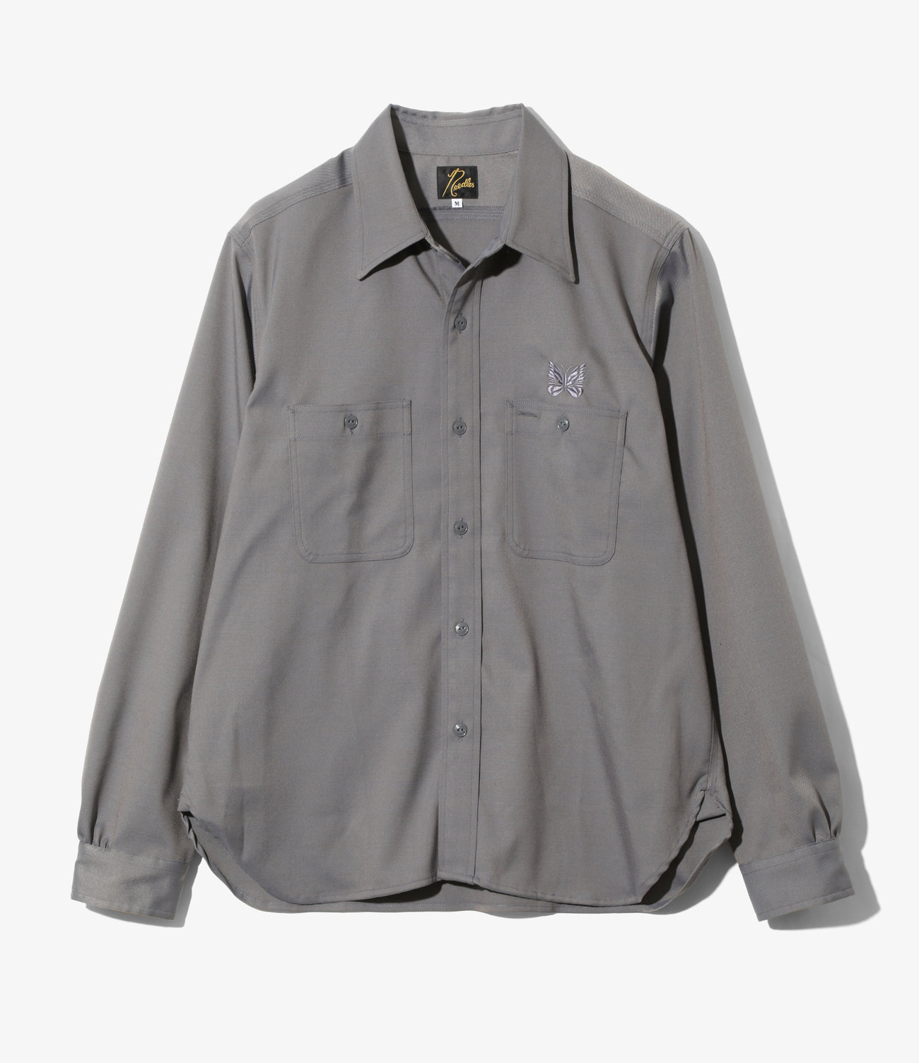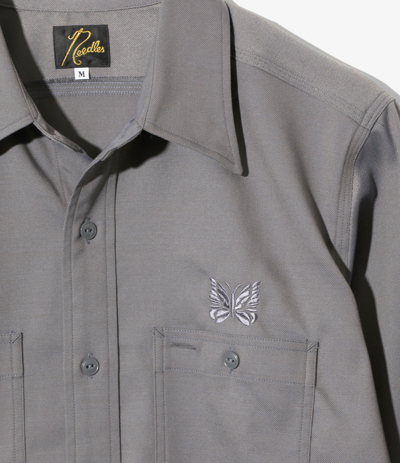 表面の綾織りがはっきりと表れる、ハリの強いツイル素材を使用して製作されたワークシャツが登場。ベーシックなデザインで、左の胸ポケットの上にはパピヨンの刺繍が施されています。同素材のパンツも2型展開されており、セットアップでの着用も可能です。