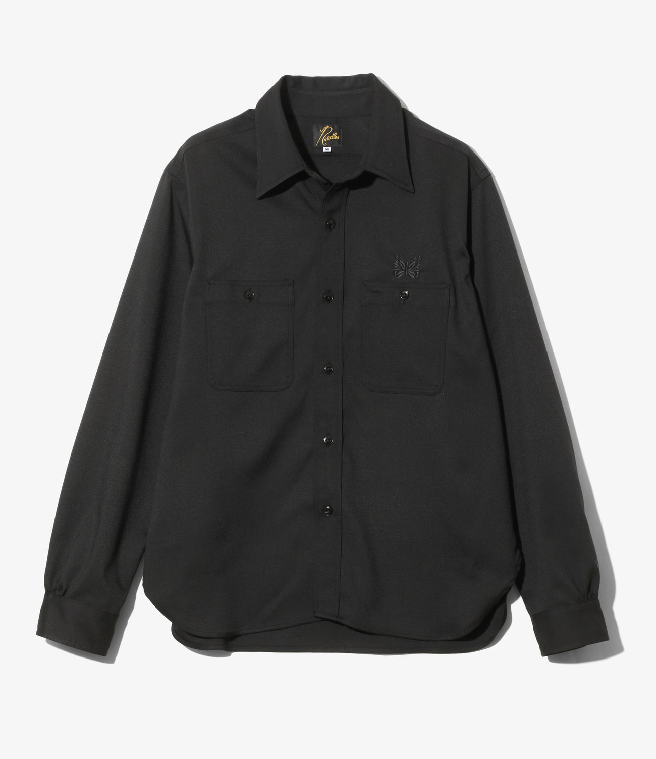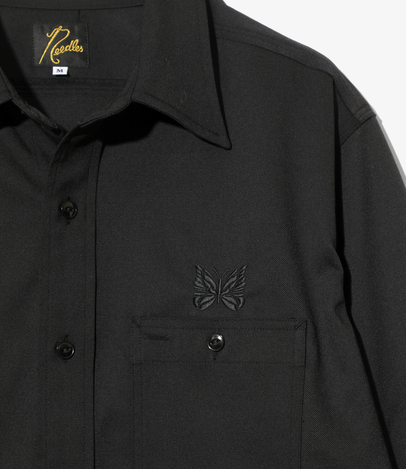 表面の綾織りがはっきりと表れる、ハリの強いツイル素材を使用して製作されたワークシャツが登場。ベーシックなデザインで、左の胸ポケットの上にはパピヨンの刺繍が施されています。同素材のパンツも2型展開されており、セットアップでの着用も可能です。