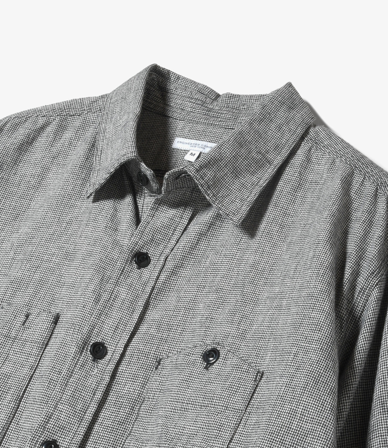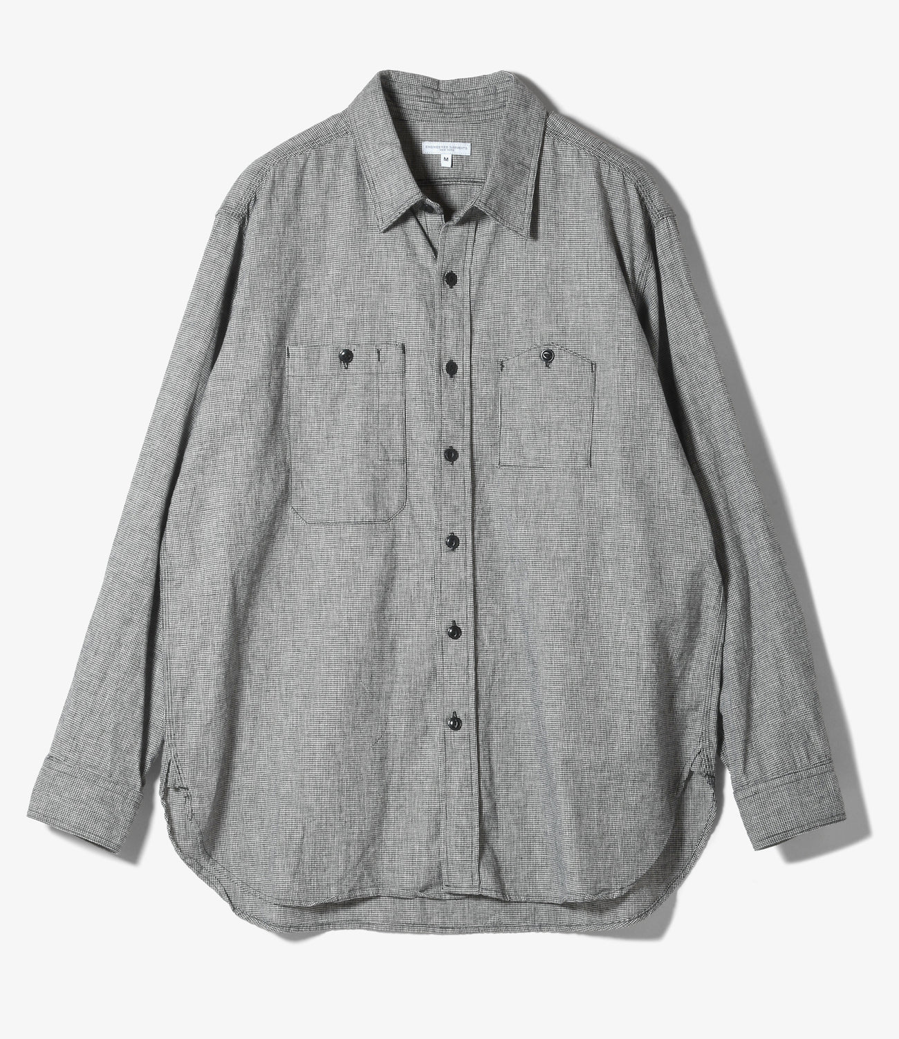 〈ENGINEERED GARMENTS〉の定番シャツであり、毎シーズン人気の高いワークシャツ。山型とペン差し付きの左右非対称の胸ポケットや、肘の補強布、猫目ボタンなど、ヴィンテージのシャツに見られるディテールを取り入れたデザインが特徴です。パーツによってシングル、ダブル、トリプルステッチが巧みに使い分けられており、細部にまでこだわりが見て取れる逸品となっています。クラシカルなムードのハウンドトゥース柄を採用。コットンリネン生地でサラッとした着心地です。