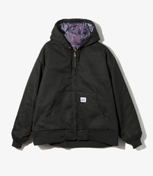 フーディタイプのカジュアルなスタイルのワークジャケット。耐久性と軽さを兼ね備えたポリエステルコットンツイルの素材を採用しました。ライニングは保温性の高いキルティング素材を使用し、〈NEEDLES〉のイメージカラーでもあるパープルで切り替えられています。カラーはバーガンディ、グリーン、ブラックの3色展開。
